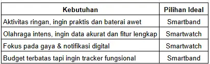 Pada akhirnya, pilihan tergantung pada gaya hidup dan kebutuhanmu. Bila kamu hanya butuh alat sederhana untuk menghitung langkah, smartband sudah cukup. Tapi jika ingin perangkat yang bisa memantau kesehatan sekaligus mendukung performa olahraga, smartwatch adalah investasi terbaik.